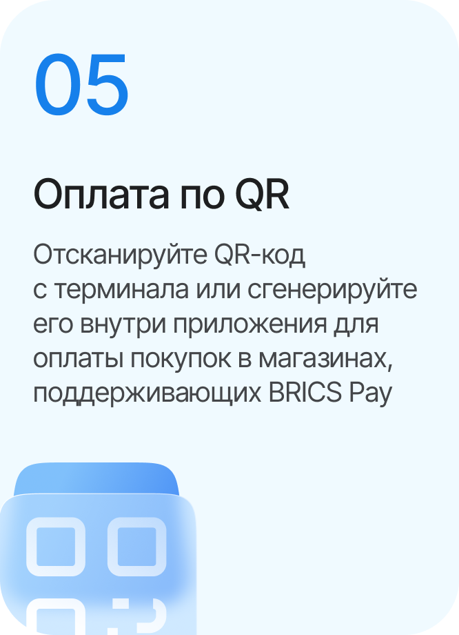 BRICS Pay C2B дает Вам свободу путешествовать как по странам БРИКС+, так и в других странах, не беспокоясь о картах, валюте или способах оплаты. Используйте свою карту и свой счет для мгновенных платежей по QR-коду в магазинах, кафе, отелях и сервисах — как дома, в национальной валюте. Путешествуйте по странам БРИКС+ и платите так, как вам удобно — с помощью уже используемых и проверенных способов оплаты. Никаких обменных пунктов, не нужно открывать местные банковские счета, никаких специальных «туристических карт», никаких скрытых посредников, взимающих комиссию — только бесперебойные, соответствующие законодательству, безналичные платежи C2B, которые будут сопровождать вас повсюду. Это BRICS Pay: Ваша финансовая свобода путешествовать, делать покупки и жить по всему миру.